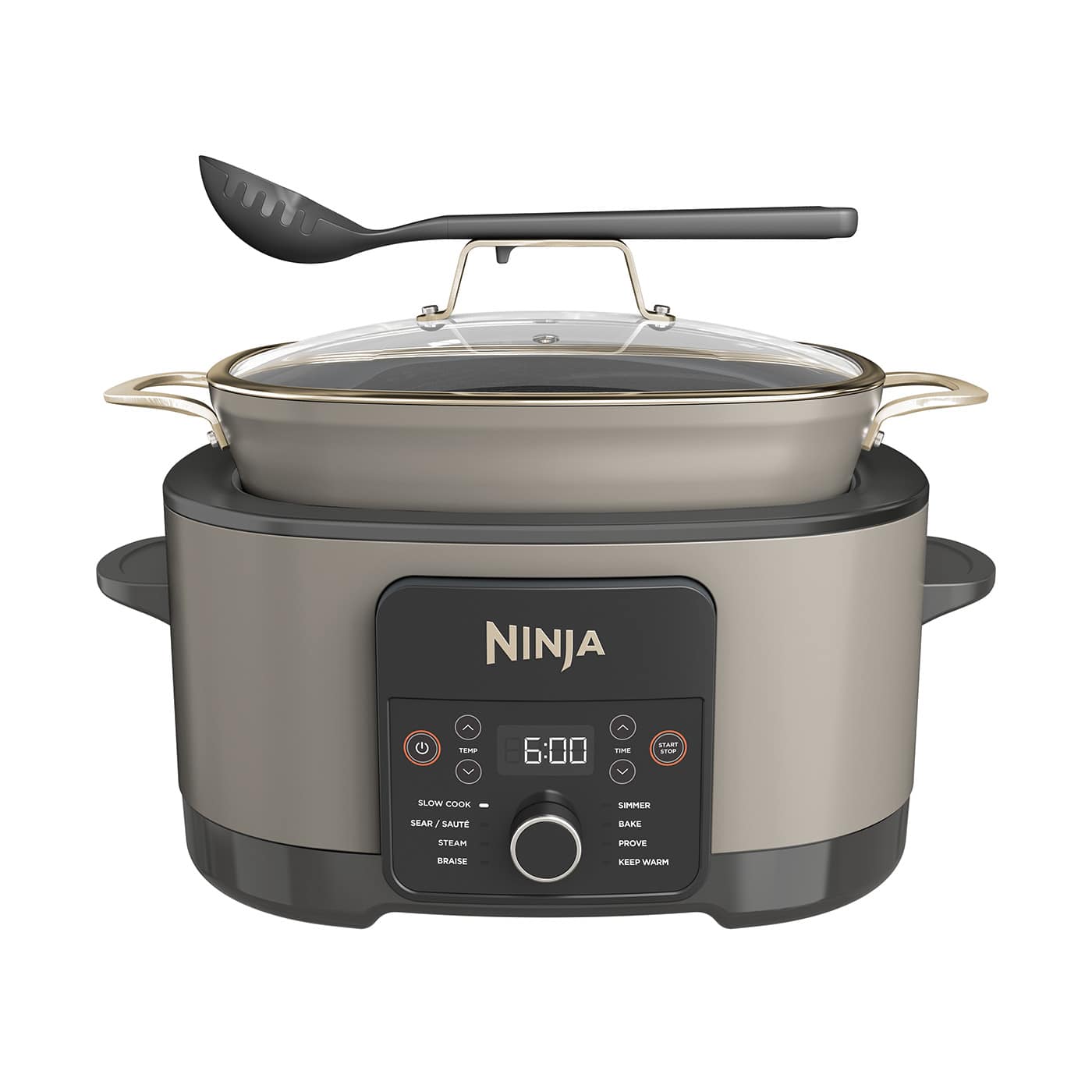 Everything you need to make it possible without turning on the hob. Say hello to your new favourite slow cooker combining 8 functions in one versatile appliance. Ninja Foodi PossibleCooker is 5x more powerful than conventional slow cookers. Unlike traditional slow cookers which only use side heating elements Triple Fusion Heat combines heating elements in the sides and base with steam heat to unlock even more cooking options – so you can also sear sauté and simmer hearty meals to share just like you would on the hob. Cook faster than conventional ovens* with no preheat. So many possibilities all in one appliance. 8 cooking functions: Slow Cook delicious stews sausage casserole and more for up to 12 hours so they’re ready when you want them. Sear and Sauté just like on the hob – perfect for caramelising onions and vegetables and searing or braising meat before cooking low and slow for tender fall-off-the-bone results. This setting is also perfect for cooking creamy risotto. Steam delicate foods such as fish vegetables and dumplings for a healthier way to cook using the included stainless steel Steaming Rack. Braise tougher cuts of meat by browning at a high heat then simmering in liquid at a low heat for tender results. Simmer soups sauces and stews casseroles curries chili and more one-pot favourites at a consistent temperature. Bake (up to 230°C) desserts such as poached fruit or creamy cheesecake. Prove rest and rise dough in a consistently warm and humid environment before popping the cooking pot straight into your oven. Keep Warm after cooking or gently reheat food without drying it out. Go from worktop to oven to table Start your creation with any cooking function then transfer the removable non-stick cooking pot to the oven to crisp up a crumble topping or give your pastry lid a perfectly golden exterior – it’s oven safe up to 240°C and doubles as an elegant serving dish that looks great on the dining table. Designed to do it all Making a stew? Sear meat for fuller flavour and braise all in the PossibleCooker pot without turning on the hob. This versatile worktop appliance replaces multiple cooking tools: Use it as a non-stick pot sauté pan cast iron skillet steamer saucepan hob slow cooker stock pot casserole dish roasting pan bread maker and food warmer. Store the integrated serving spoon in the oven-safe glass lid’s cast stainless-steel handle for compact storage away from the work surface. Family size The 8L capacity is perfect for cooking up to 8 portions. Great for feeding a crowd or batch-cooking food to freeze. The cooking pot utensil and glass lid are dishwasher safe for easy cleaning or you can wash by hand. Get started straight away with the included chef-created Recipe Guide. Want to know what people think of the Ninja Foodi 8-in-1 PossibleCooker? Scroll down to see real customer reviews. *When cooking large proteins.